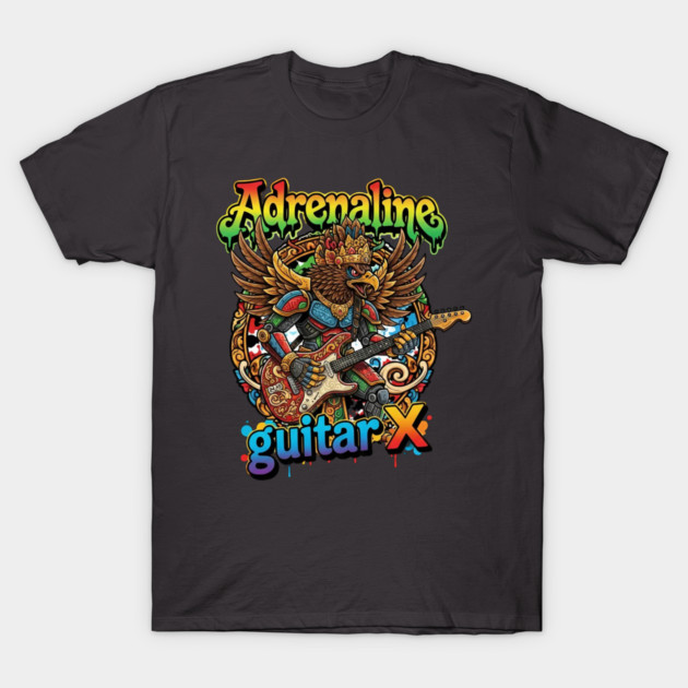 Adrenaline Guitar X, TeePublic rock shirt, tribal guitar art, digital art t-shirt, eagle warrior design, fantasy rock apparel, music inspired artwork, psychedelic rock design, vibrant illustration, independent artist TeePublic